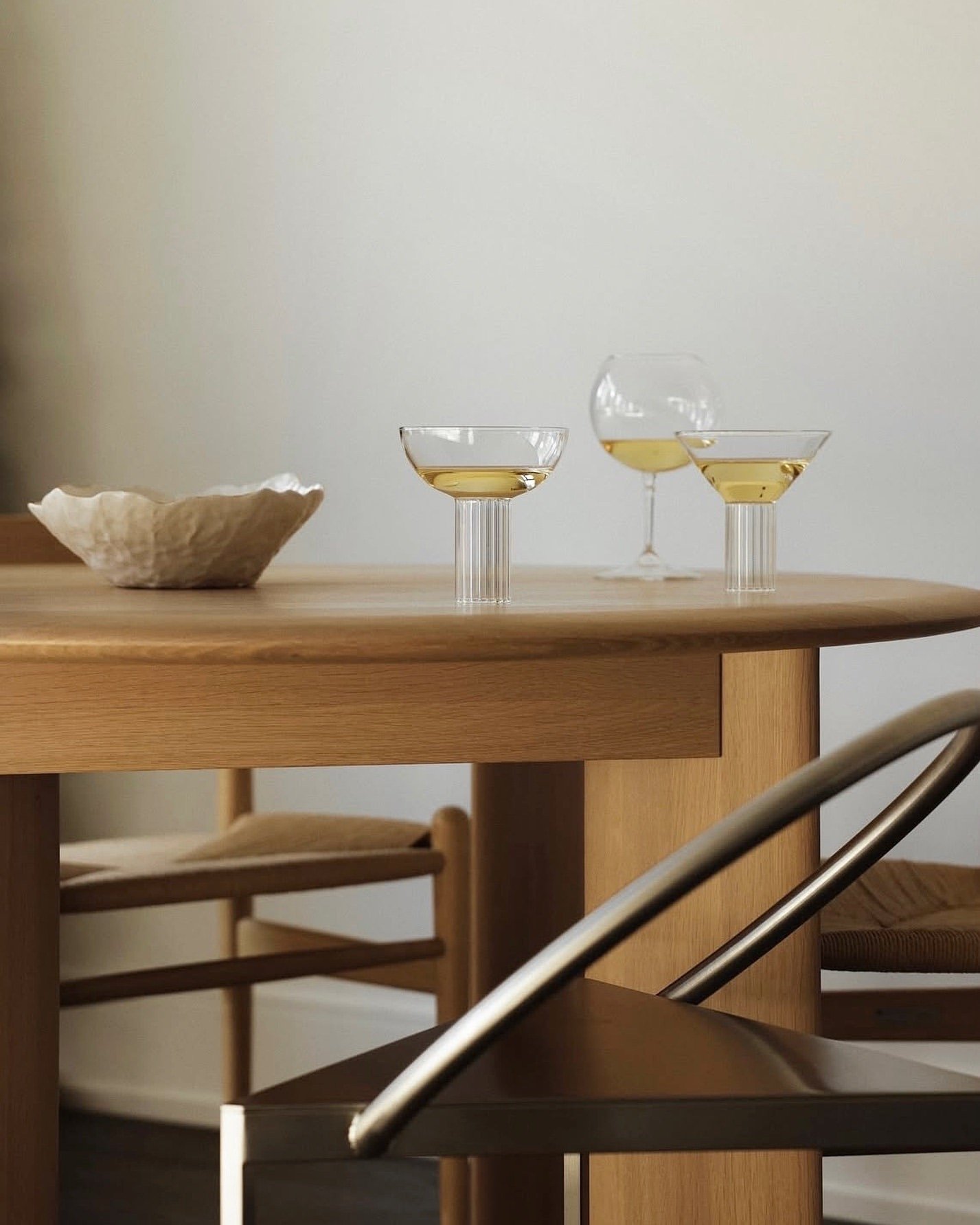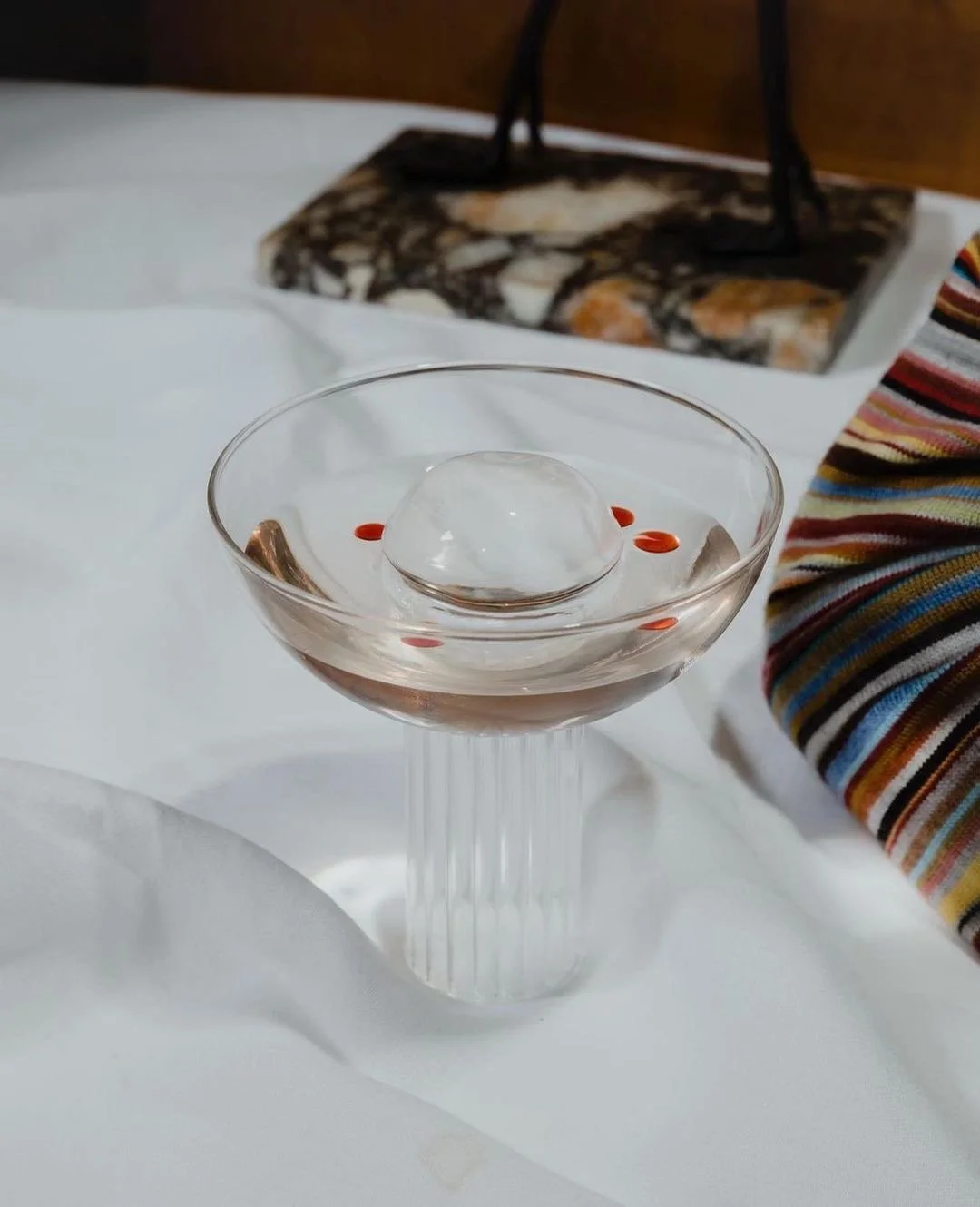 Inspired by the bold lines of Postmodern architecture, this lowball glass features a striking, atypical shape. Each piece is handmade in Italy by master glassblowers using high-quality borosilicate glass. The ribbed body rests on three clear spheres, playfully elevating any drink. Perfect for cocktails and distilled spirits like whisky.